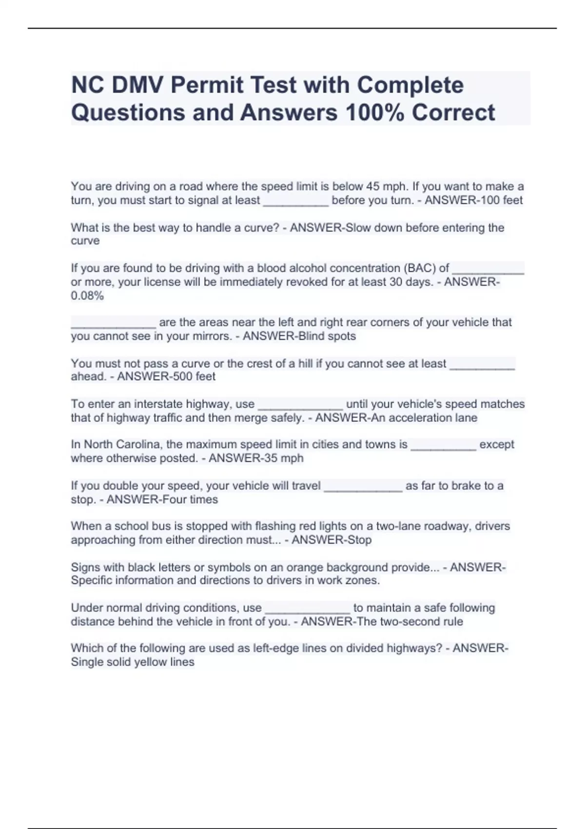 NC DMV Permit Test Questions & Answers 2023 - NC DMV - Stuvia US